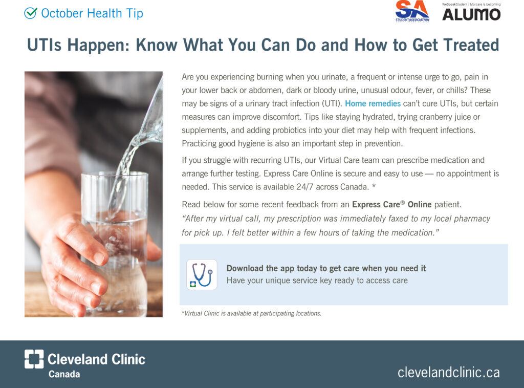 Manage your health in a new way this year through the Virtual Clinic powered by WeSpeakStudent and Cleveland Clinic Canada. Students can skip the walk-in clinic and long wait times to get instant access to a  nurse practitioner with Cleveland Clinic Canada’s Express Care Online app and the on-campus Virtual Clinics. Whether you need a diagnosis, prescription, medical advice, sick notes, and more, you can gain access to a new level of healthcare anytime you need it.