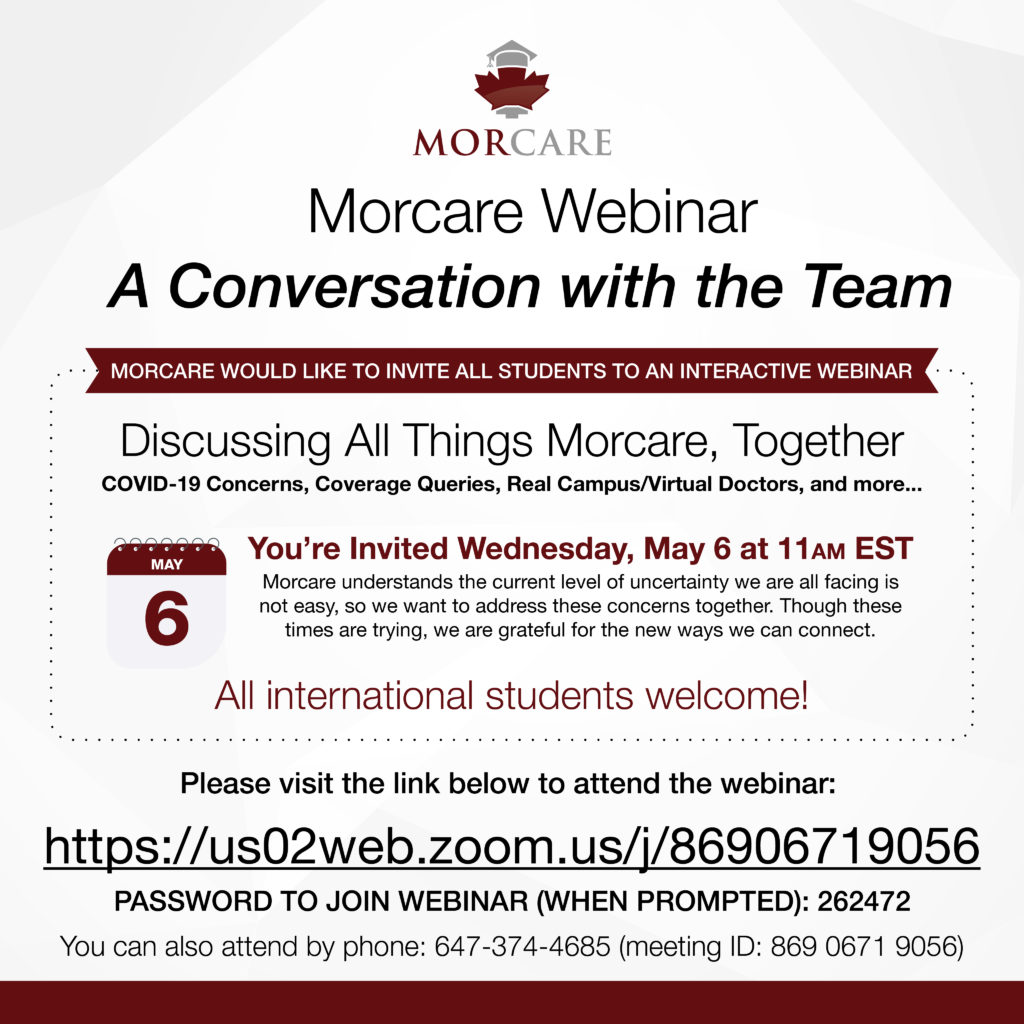 - Morecare Webinar for INTERNATIONAL students, your questions answered- was April 7th at 11 am.