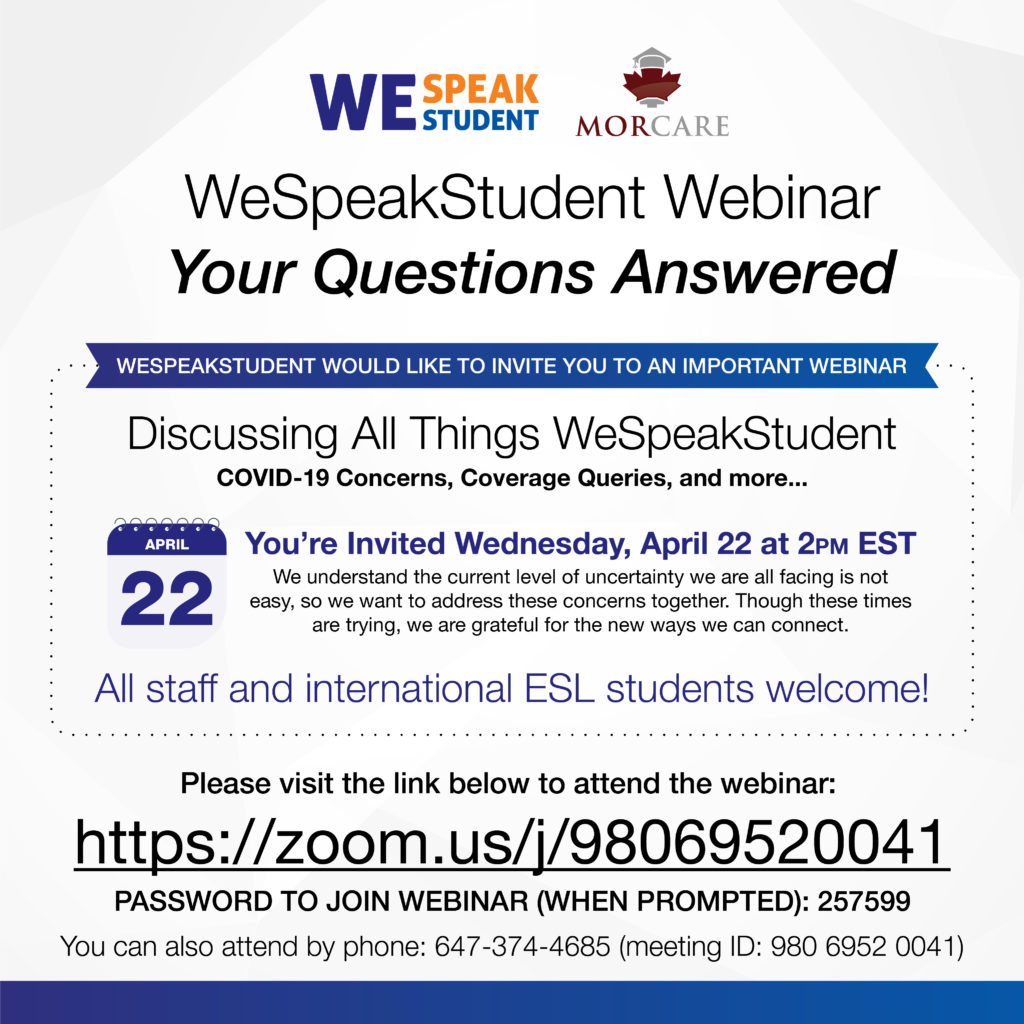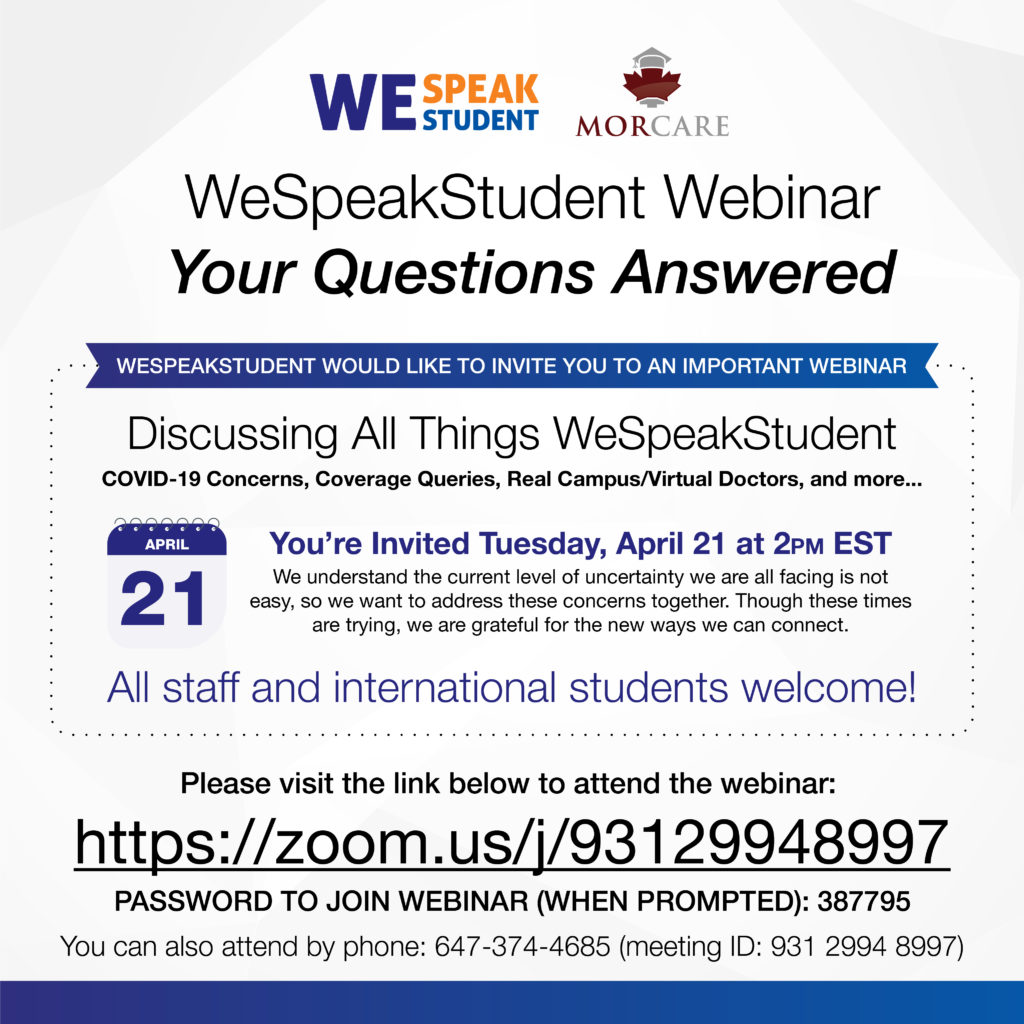 - WeSpeakStudent Webinar for INTERNATIONAL students in Post-Secondary program, your questions answered – April 21st at 2 pm.