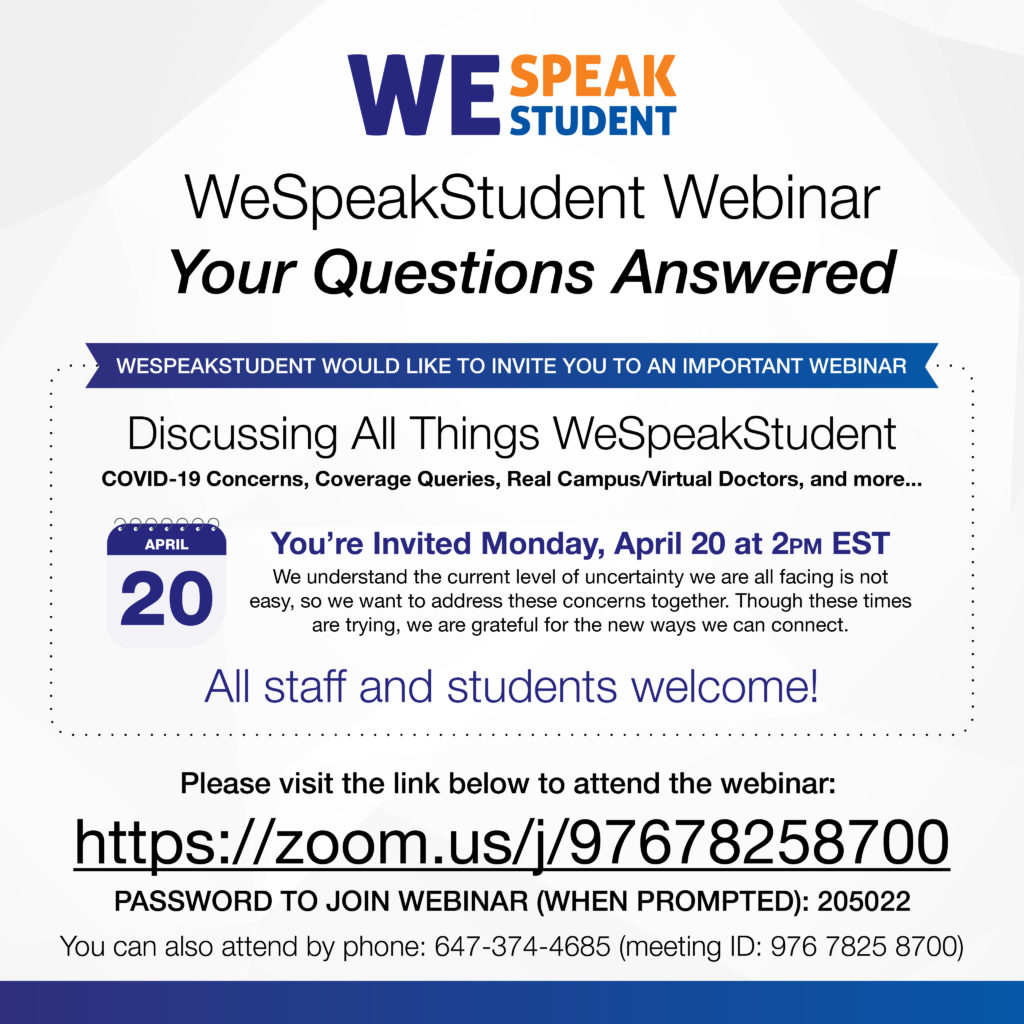 - WeSpeakStudent Webinar for INTERNATIONAL students in Post-Secondary program, your questions answered –May 6th @ 11am